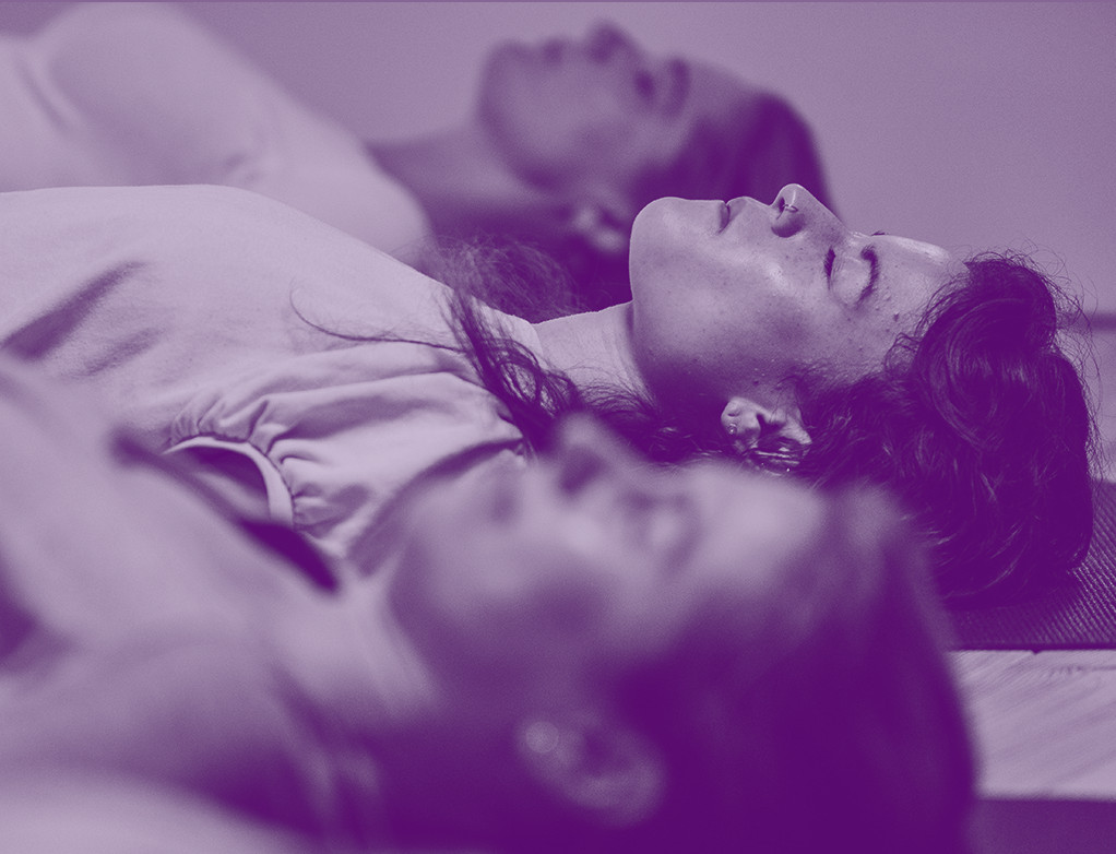 Chacun est allongé à même le sol, tourné vers le ciel, les yeux clos pour mieux s’intérioriser (un coussin posé sur les paupières), dans l’immobilité, guidé pour lâcher-prise progressivement, laisser les couches les plus grossières du mental se dissoudre pour accéder à des niveaux plus subtils.